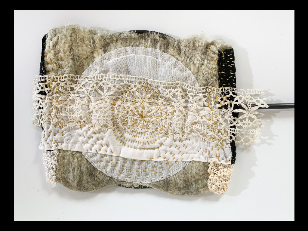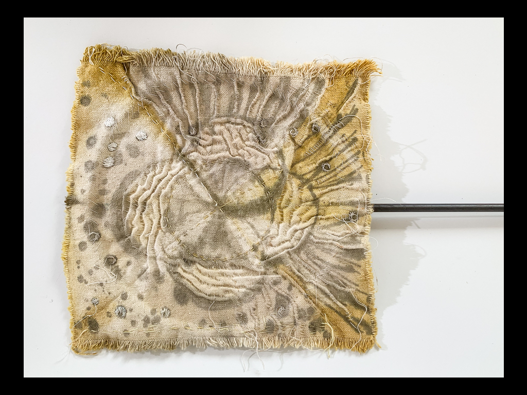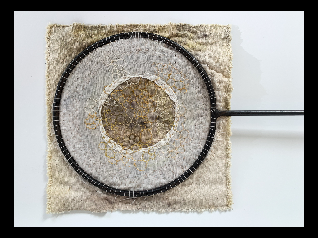 Pendant un an, j’ai fait une petite broderie à chaque semaine pour 52 semaines. Le processus d’art textile me permet de travailler dans la nature et avec 4 éléments, soit la terre, l’eau, le feu, et l’air.
