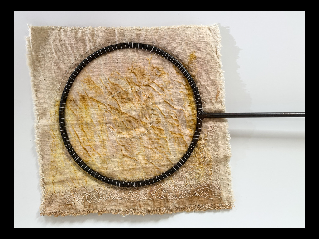 Des fleurs, des feuilles et des minéraux sont enveloppés et attachés en y ajoutant des fils à broder en coton blancs pour être ensuite bouillis pour teindre ainsi les tissus et de laisser des marques. Viens ensuite l’assemblage et la broderie intuitive.