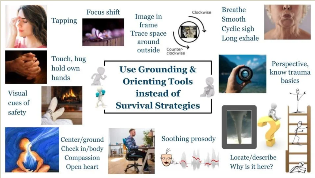 Vous pouvez pratiquer de plus en plus souvent vos 12 exercises somatiques et visiter https://lynnfraserstillpoint.com/emergency-practice/30-go-to-practices. En voici 10 outils de grounding et d’orientation présentés dans cette image :