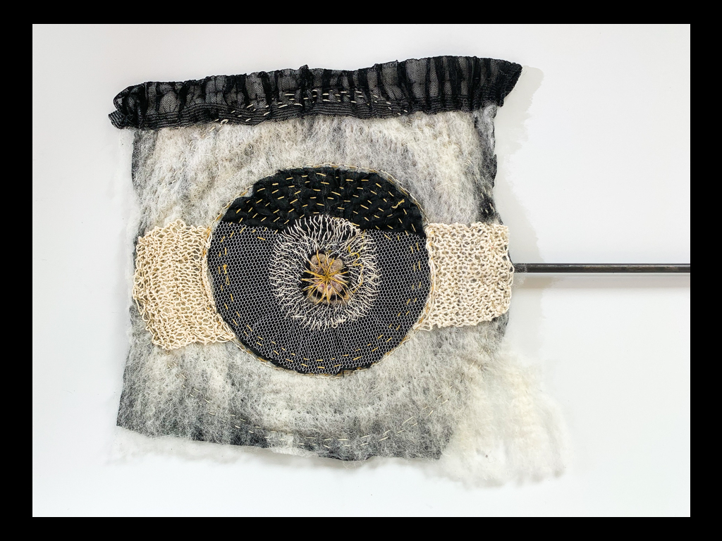 Grâce à une bourse de création d’ArtsNB, son projet d’installation « Innocence » présente une série de six pans de petites robes d’enfants posées sur des cages métalliques. Les deux côtés de chaque œuvre sont approchés différemment pour parler d’intéroception avec le passage d’une personnalité fragmentée qui veut plaire, se défend et se protège dans un mode de survie, vers l’intégration d’un Soi unifié vivant dans un attachement sécure.